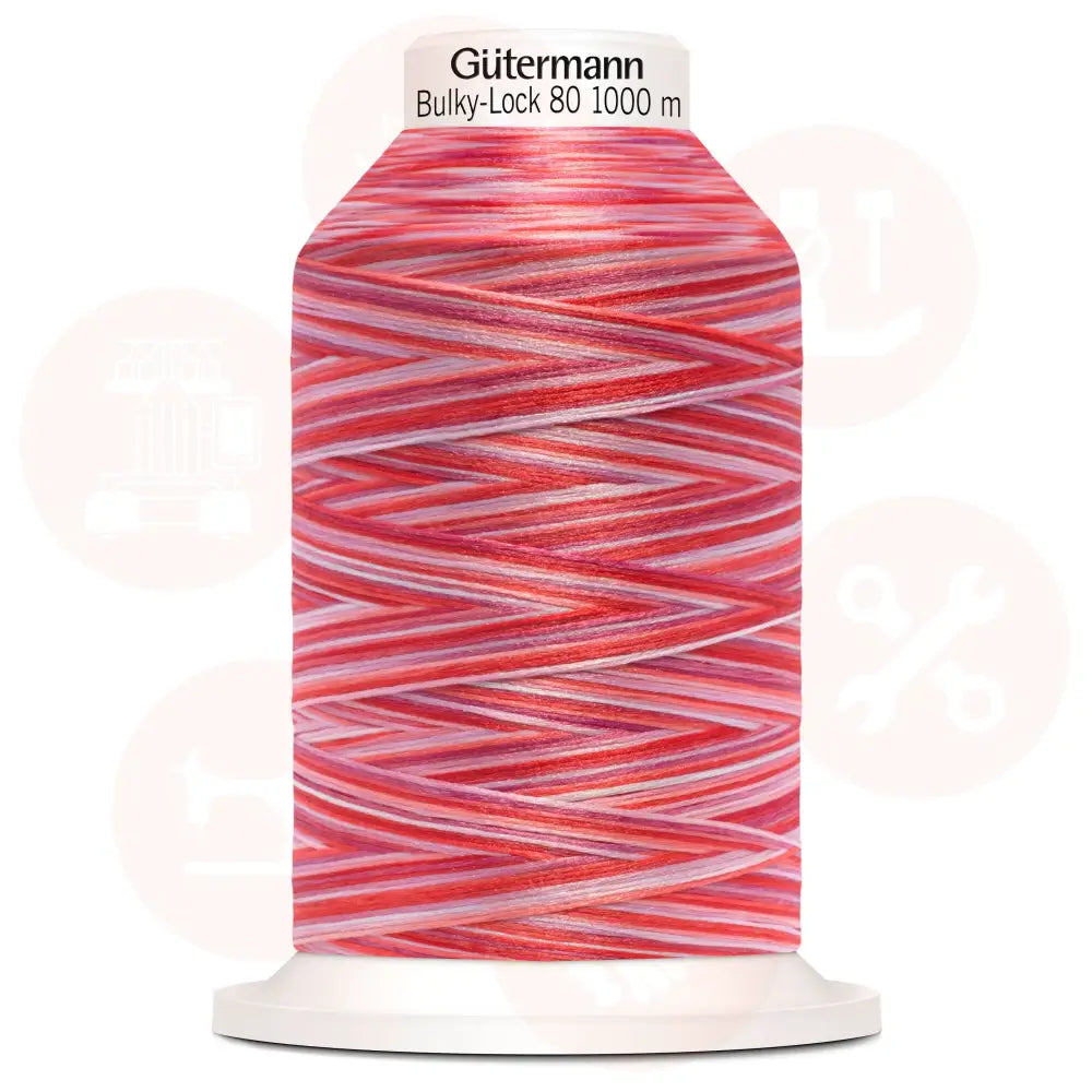 Multi-coloury, elastic bulk thread in thickness No. 80 for pleasantly soft serging and dense cover on cut edges on heavy to medium-weight fabrics.