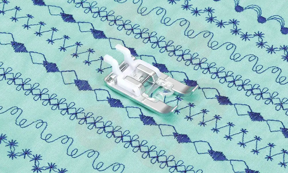 The new N+ foot has a durable coating for feeding fabric smoothly. The plastic guide helps to minimize the misalignment of the material. Perfect for sewing monogramming, decorative, satin and alphabet lettering stitches where more visibility is needed.