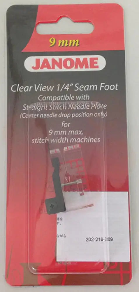 In response to requests from quilters all around the world Janome has developed this clear view seam foot for use with the straight stitch needle plate on 9mm machines. This foot allows you to sew seam piecing, indispensable for quilt work, using the straight stitch needle plate. You will be sure to enjoy the precise and elegant finish this foot provides for your patchwork piecing!