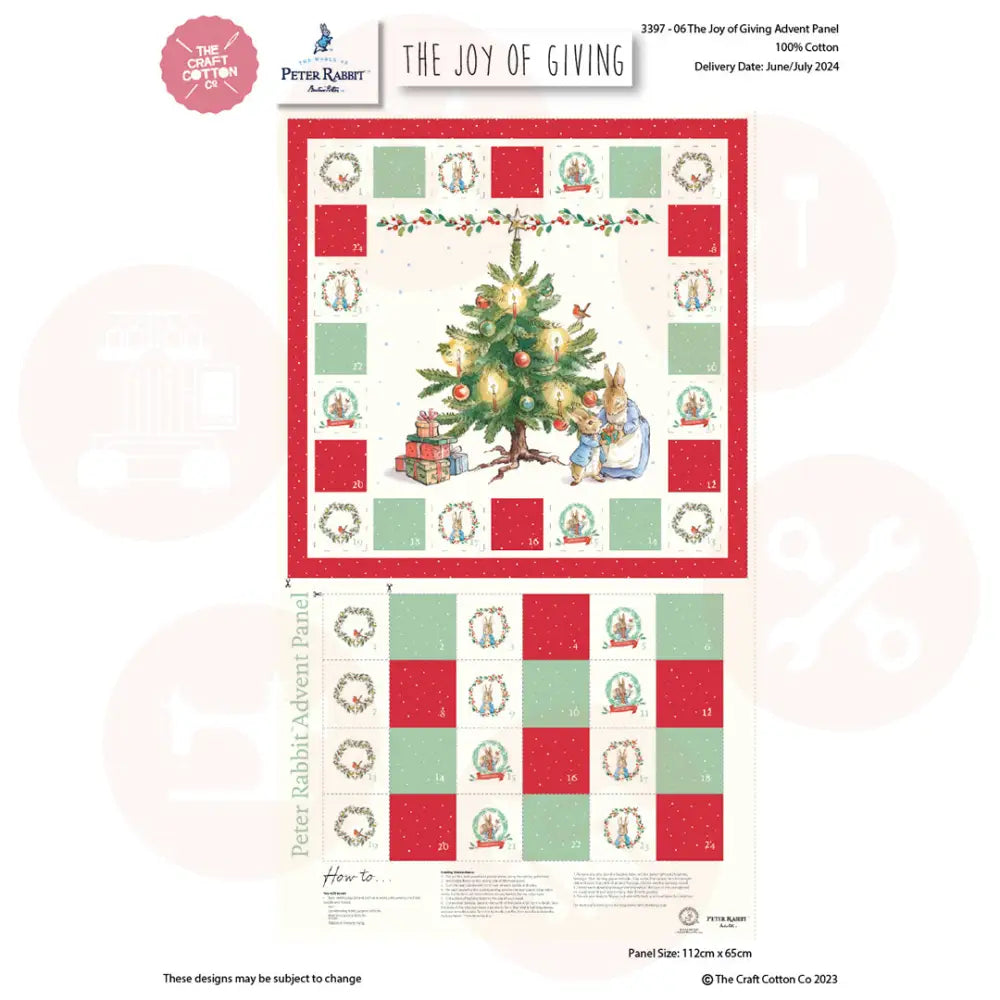 Christmas Peter Rabbit advent panel from Craft Cotton Company, featuring classic Beatrix Potter illustrations surrounded by robins, wreaths, holly, snow and Christmas trees.